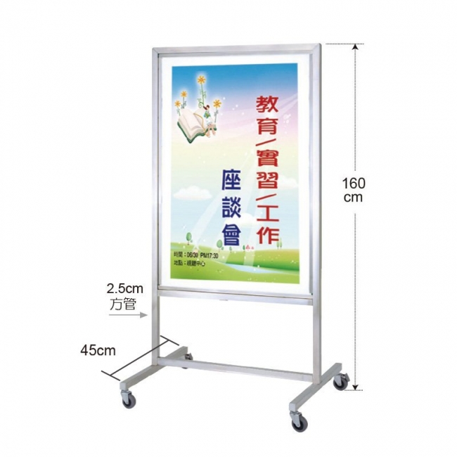 不鏽鋼雙面海報架-透明壓克力上抽設計、兩面皆可插入海報、不鏽鋼材質,一體成形,底座附輪及煞車、方便移動,產品不割手無銳利邊角,組裝便利且堅固耐用。適用於大廳、百貨公司、展示中心及機場等公共空間等場所。